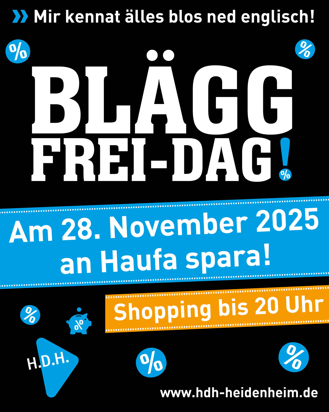 Am Freitag, den 28. November, lädt Heidenheim wieder zum beliebten „Blägg Freidag“ ein. Die Aktion, die in den vergangenen Jahren viele Besucherinnen und Besucher begeistert hat, bietet auch dieses Mal zahlreiche attraktive Angebote und tolle Rabatte – eine gute Gelegenheit, das ein oder andere Schnäppchen zu machen.